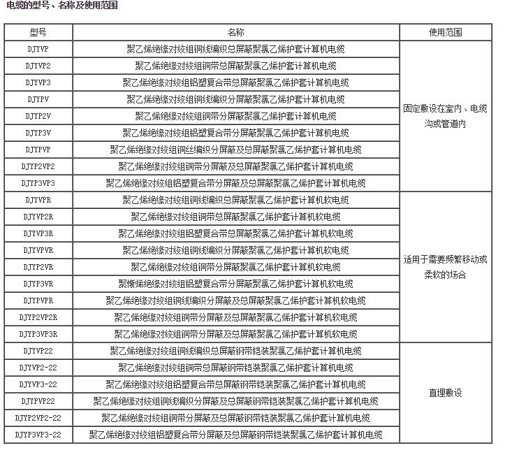 屏蔽材料有圓銅線、銅帶、鋁箔/塑料復合帶三種。屏蔽對與屏蔽對具有較好的絕緣性能,電纜在使用中若屏蔽對與屏蔽對之間出現(xiàn)電位差時,不會影響信號的傳輸質(zhì)量。 計算機電纜的型號、名稱及使用范圍見表。